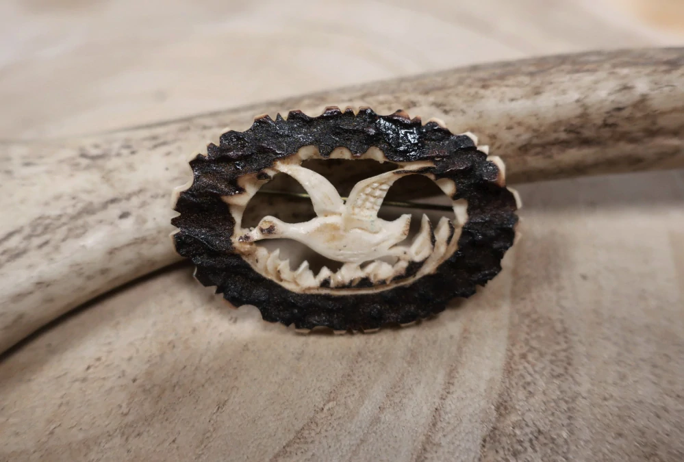 Ručně vyřezávaná brož z paroží.