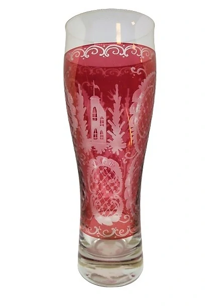 Bezbarvá půllitrová sklenice s rubínovou lazurou a s broušeným a řezaným dekorem.