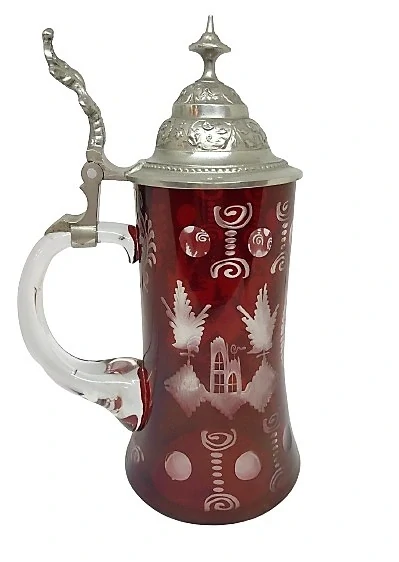 Červeně lazurovaný korbel na pivo s cínovým víčkem.
