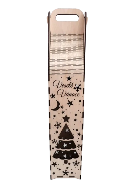 Dárkový dřevěný box na 1 láhev. Box je vyroben z kvalitní překližky. Část přední strany je otevřená a opatřená vánočním motivem.