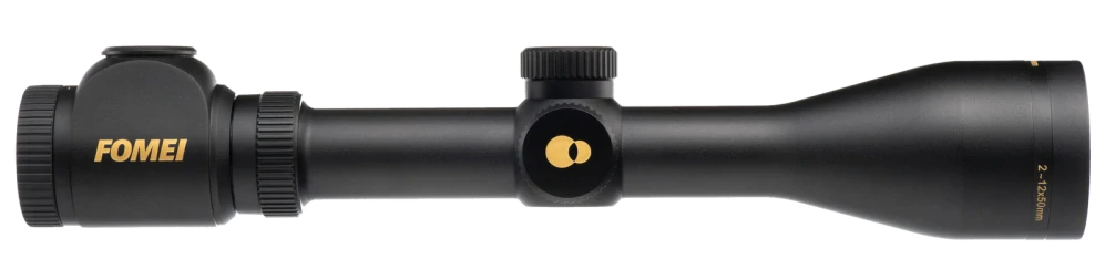 Univerzální puškohled se zvětšením 2-12x, záměrnou osnovou G4, antireflex HTC, regulací paralaxy a elektronickou regulací červeného bodu od značky Fomei.