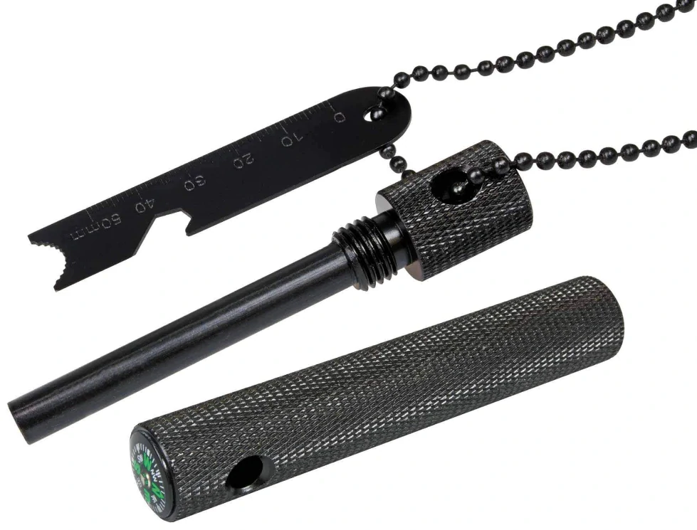 Třísky, které lze vyrobit přiloženým škrabákem, pomáhají velmi rychle zapálit táborový oheň nebo nouzovou pochodeň. Robustní konstrukce v hliníkovém těle se závitem a protiskluzovou úpravou. Orientační, zpracováním spíše dekorativní miniaturní kompas je integrován do pouzdra.