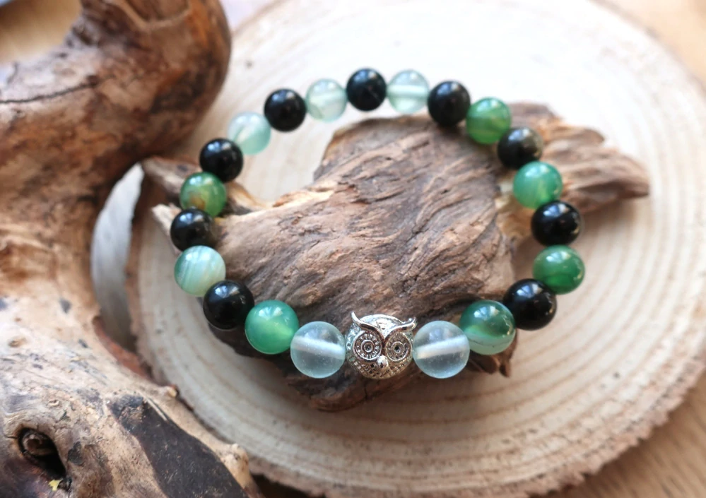 Náramek Sovička z minerálů achát světle zelený, černý obsidián a watermelon, doplněný korálkem sovičky z bižuterního kovu.