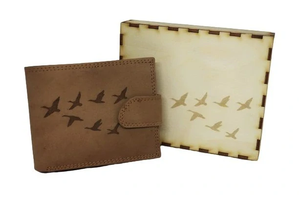 Kvalitní myslivecká kožená peněženka s motivem letících kachen.