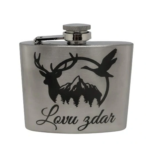 Nerezová placatka na alkohol, na které je vygravírovaný motiv viz obrázek. Obrázek s textem je vytvořen pomocí laserového gravírování. Uzávěr nerezové placatky je upevněn na pohyblivém kloubu, takže se Vám nemůže ztratit. Jedná se o originální dárek, který potěší srdce každého myslivce.