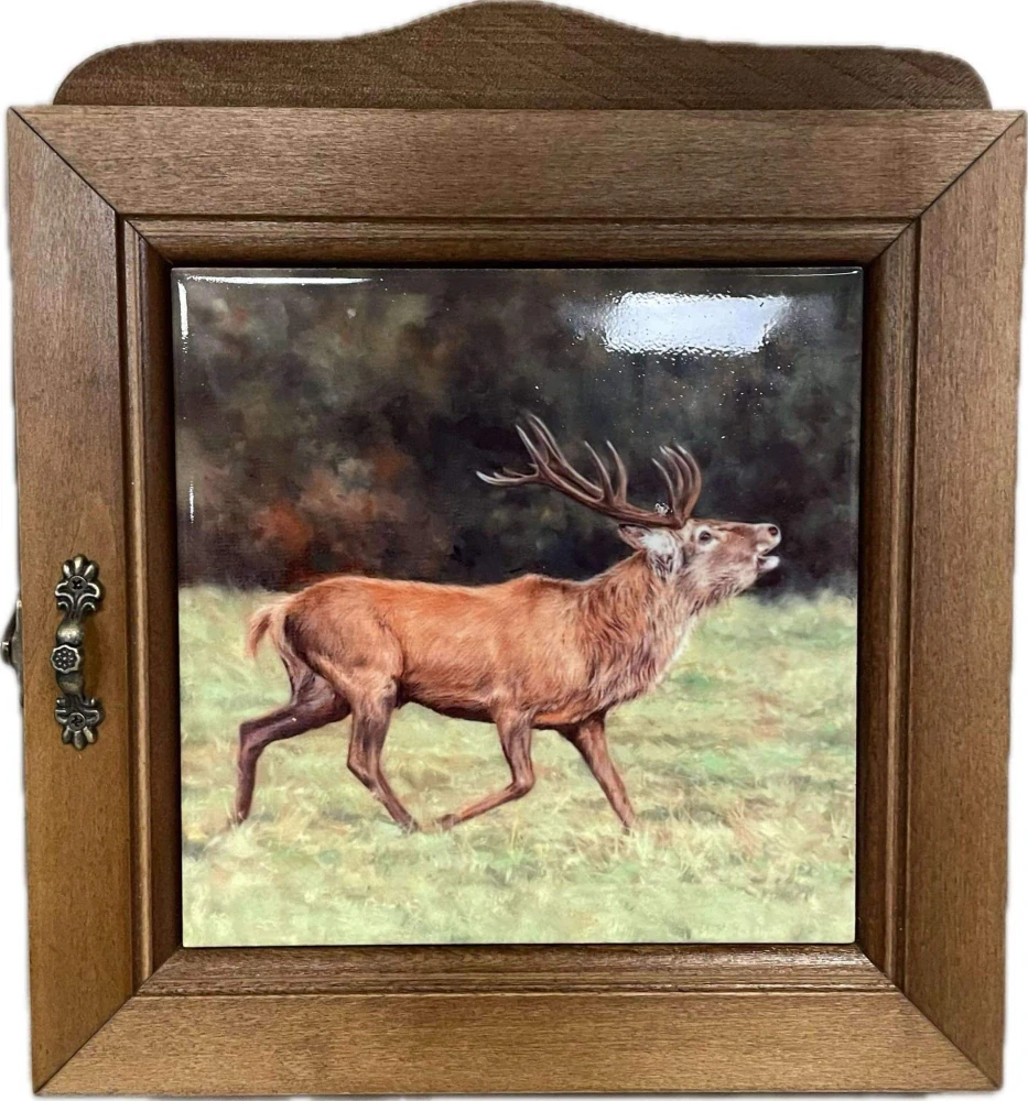 Myslivecká dřevěná skříňka na klíče s motivem jelena.