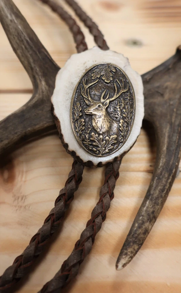 Slušivé myslivecké bolo je vhodné pro všechny společenské akce. Bolo je vyrobené z parohu, ozdobené kovem a zavěšené na celokoženém pleteném řemínku s kovovým zdobným zakončením.
