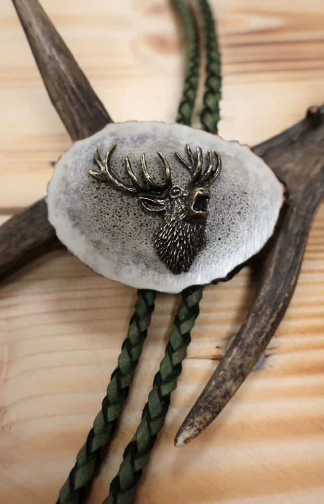 Slušivé myslivecké bolo je vhodné pro všechny společenské akce. Bolo je vyrobené z parohu, ozdobené kovem a zavěšené na celokoženém pleteném řemínku s kovovým zdobným zakončením.