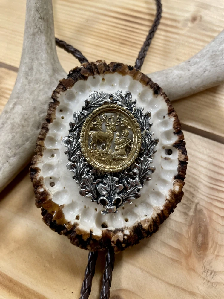 Slušivé myslivecké bolo je vhodné pro všechny společenské akce. Bolo je vyrobené z parohu, ozdobené stříbrným medailonkem s motivem mysliveckého patrona, Svatého Huberta. Součástí balení je dárková papírová krabička.