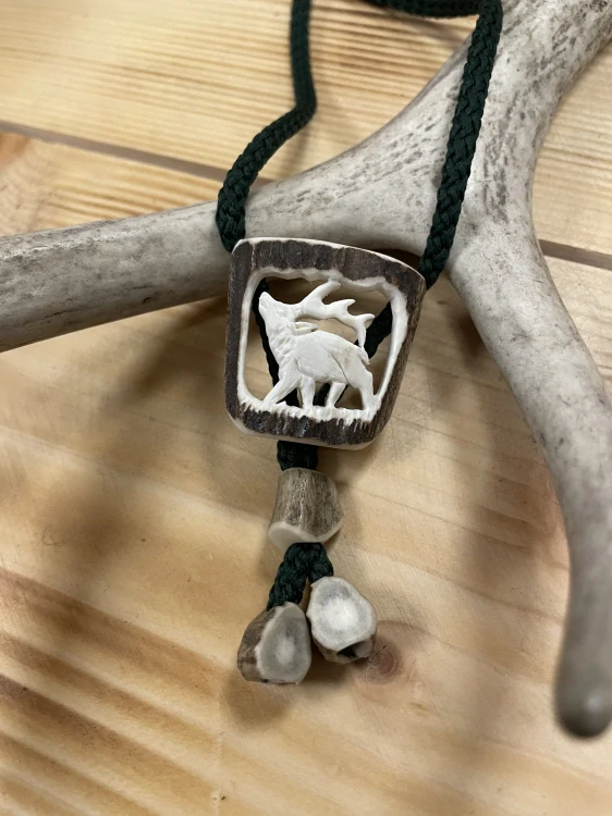 Ručně vyřezávané bolo, ozdobný přívěsek na krk s motivem jelena.