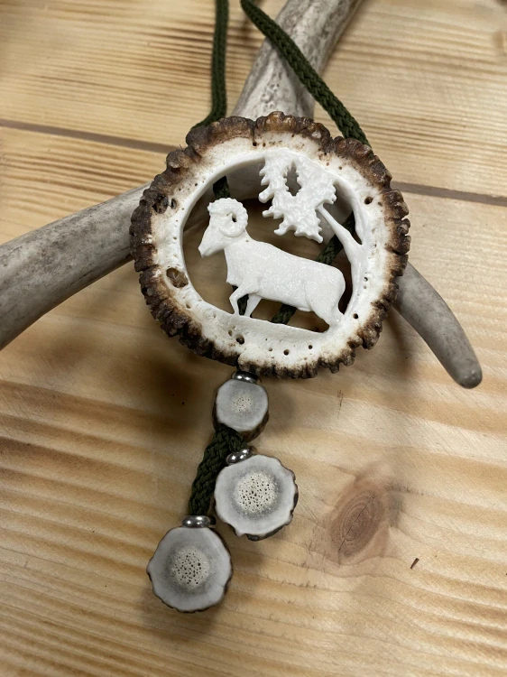 Ručně vyřezávané bolo, ozdobný přívěsek na krk s motivem muflona.