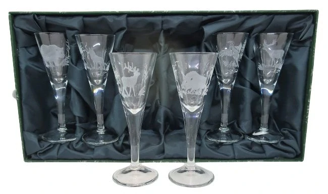 Sada 6ks sklenic Jagerglass. Ruční práce. Vyrobeno na Slovensku. Sklenice na likér v dárkovém balení zcela jistě potěší každého myslivce!