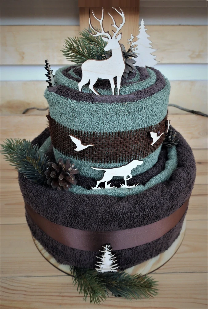 Dvoupatrový textilní dort pro myslivce je složený ze 2 bavlněných ručníků a 2 bavlněných osušek. Dort je zdobený dřevěnými výřezy, šiškami, umělými větvičkami a stuhami.