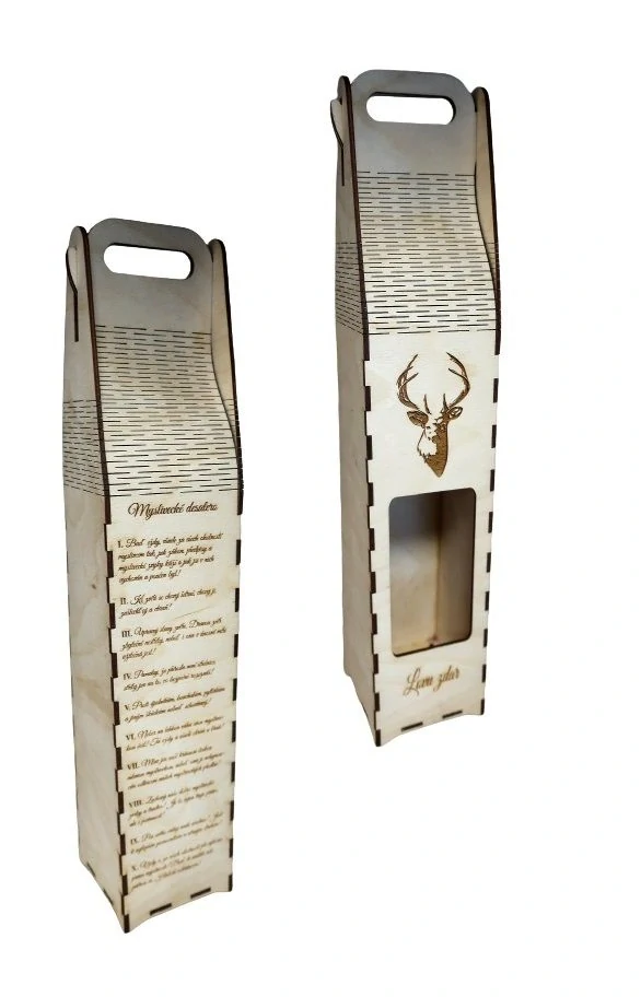 Dárkový dřevěný box na 1 láhev. Box je vyroben z kvalitní překližky. Část přední strany je otevřená a opatřená obrázkem jelena s textem lovu zdar. Zádní strana je opatřená potiskem pro myslivce - myslivecké desatero.