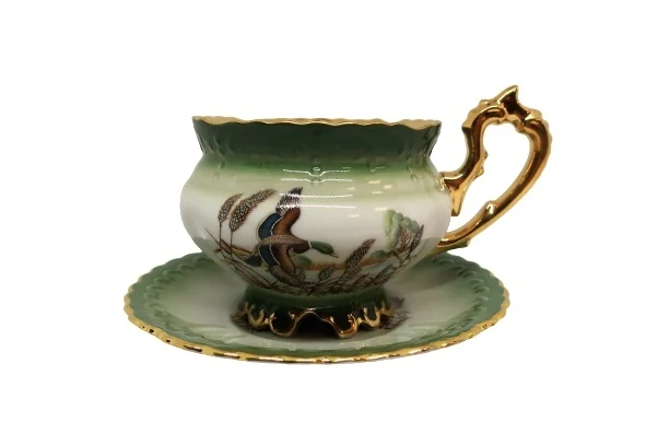 Myslivecký porcelánový hrnek s podšálkem s motivem kachny.