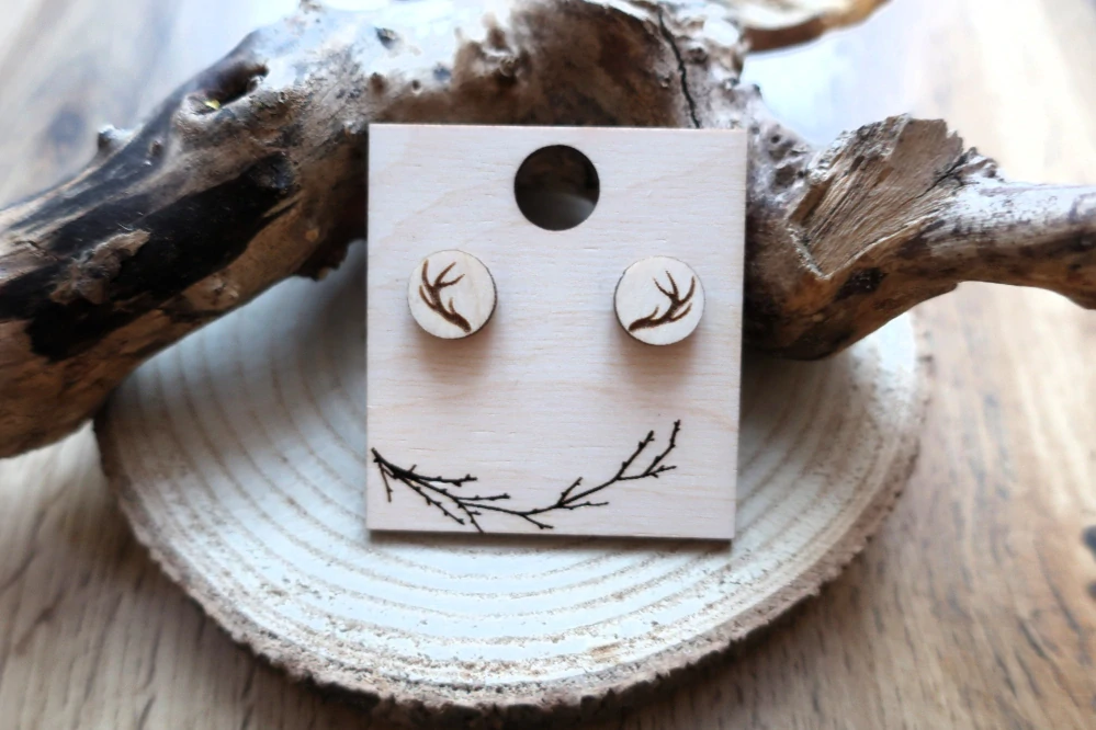 Dřevěné myslivecké náušnice pecky s motivem jeleních parohů.