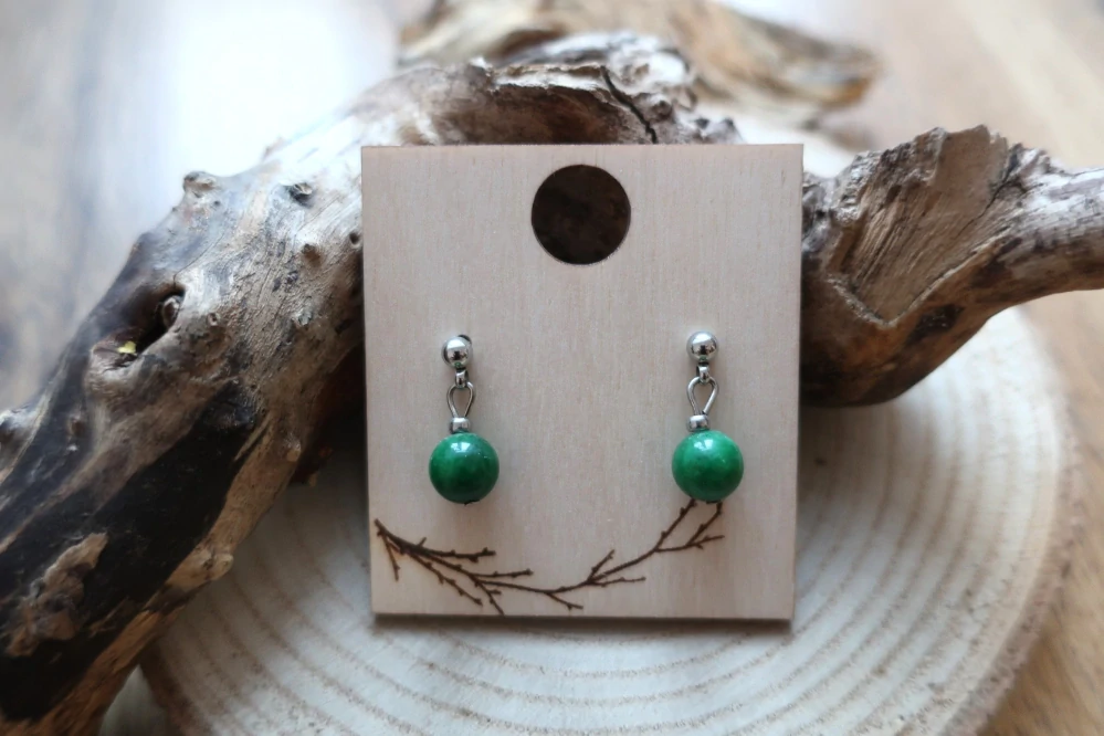 Délka náušnic činí 2 cm. Náušnice jsou vyrobené z jadeitu zeleného. Náušnicové puzety a kuličky jsou z chirurgické oceli. Náušnice jsou opatřené silikonovými zarážkami. Nerezová ocel je hypoalergenní, tudíž nezpůsobuje žádné alergické reakce. Jedná se o tvrdý a velmi odolný kov.