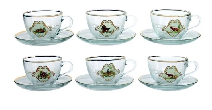 Sada skleněných hrnků s podšálky na kávu nebo čaj s různými mysliveckými motivy od firmy Jagerglass.