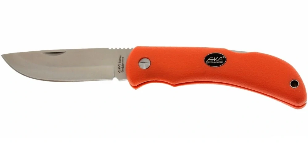 Tradiční švédský výrobce pracovních a loveckých nožů firma EKA, založena 1882 má nyní v nabídce novinku. Jedná se o praktické a pevné zavírací nože s pojistkou. Na čepel je použita velmi kvalitní a osvědčená ocel Sandvik 12C27 precizně kalená na 59 HRC. Síla čepele je 3mm, duté ostří je vytaženo do jemného břitu. Nůž má vynikající řezné vlastnosti. Rukojeť je vyrobena z měkčeného polyuretanu reflexní oranžové barvy, která zajišťuje snadné hledání nože při jeho ztrátě. Materiál je velmi příjemný na dotyk a má protiskluzovou úpravu. Tyto nože jsou vhodné pro jakékoliv lovecké a outdoorové aktivity, vyznačují se vysokou kvalitou zpracování a ušlechtilými materiály.
