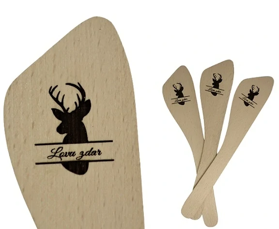 Myslivecká dřevěná vařečka, na které je vygravírovaný motiv viz obrázek (1 ks). Obrázek s textem je vytvořen pomocí laserového gravírování.